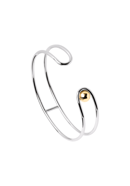 Our Yellow Gold and Silver Nina Bracelet captivates with its harmonious combination of rounded shapes and graphic lines, as well as the pairing of two materials. It is composed of two round silver wires, enhanced by a central yellow gold pearl.