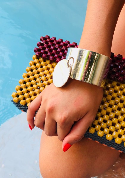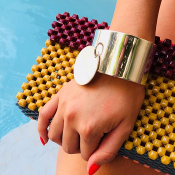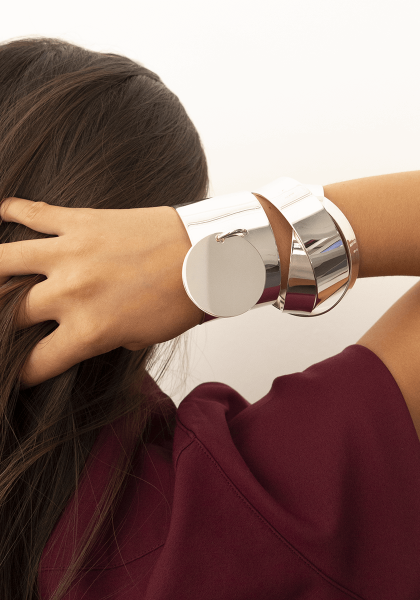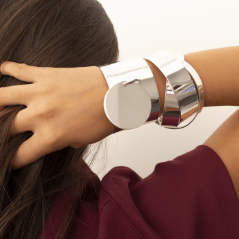 Notre Manchette 40 Médaille est un bracelet minimaliste de type jonc plat qui reprend notre icône de la maison. Il peut se porter seul ou en accumulation avec notre Manchette 40, Manchette 20 et Manchette Sunset.