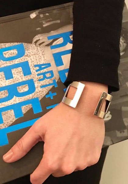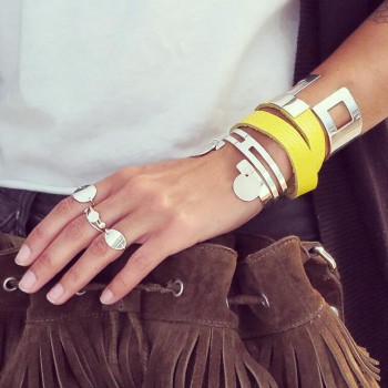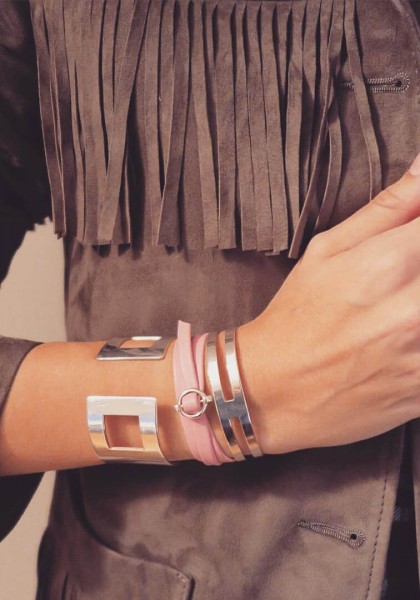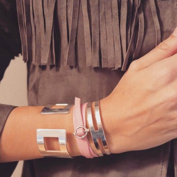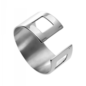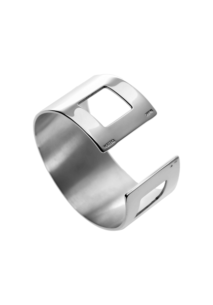 Notre Manchette Bonnie est un bracelet ouvert en argent massif percé de deux carrés sur le dessus.
