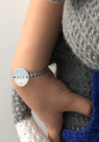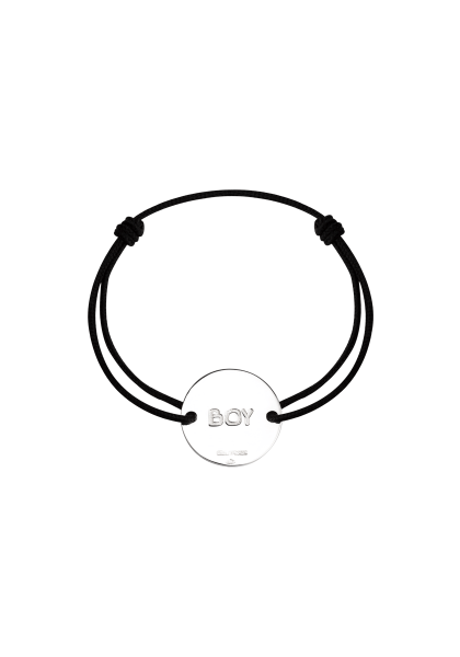Bracelet composé d'une médaille avec l'inscription "BOY" en argent massif. Les liens de nylon sont disponibles dans de nombreux coloris.