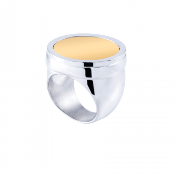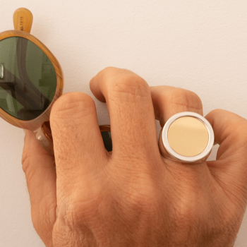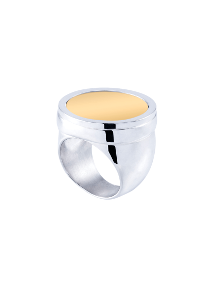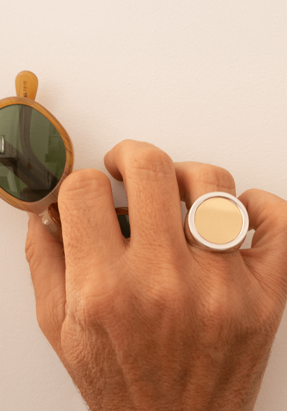 Notre Bague Chevalière Bicolore Grand Modèle Or Jaune et Argent est une création unique qui allie l'élégance du design intemporel à la modernité des contrastes. Confectionnée avec soin, cette bague en argent massif est sertie d'une médaille plate en or jaune 18 carats.