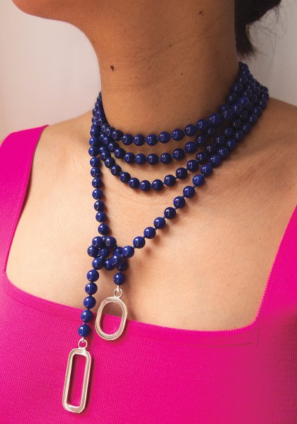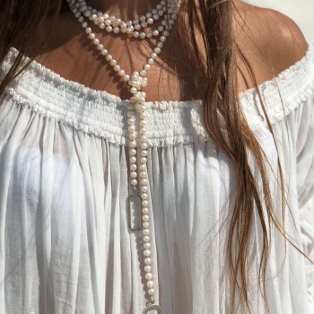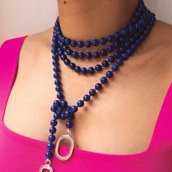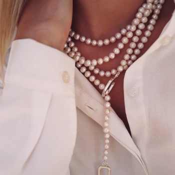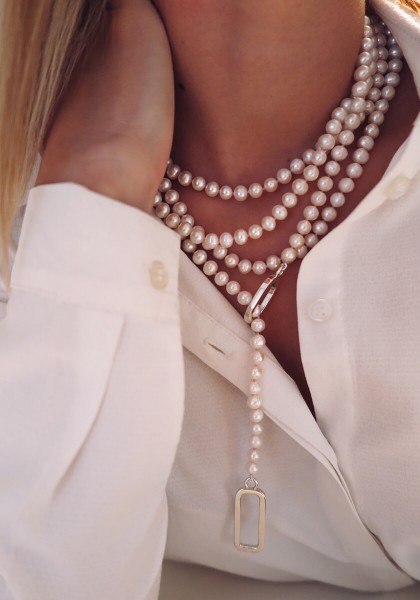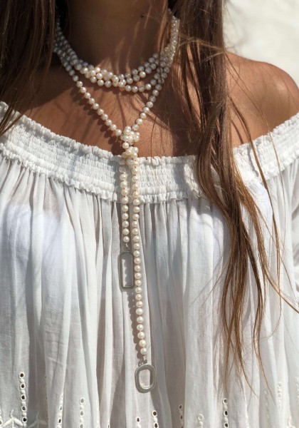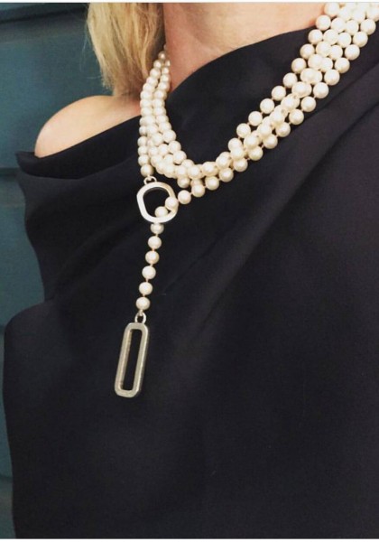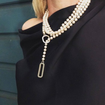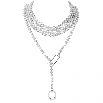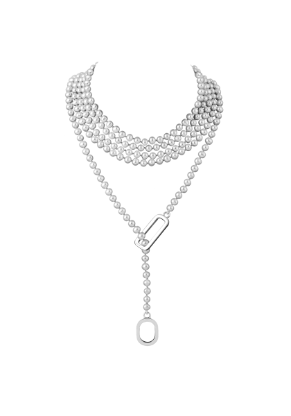 Notre Collier Lio Perles revisite le collier de perles dans un ruban avec deux anneaux aux formes distinctes – ovale et rectangulaire – à ses extrémités pouvant servir de fermoir.