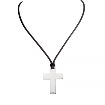 Notre Pendentif Croix Petit Modèle représente une croix plate en argent montée sur un cordon épais de coton enduit, de la couleur de votre choix.