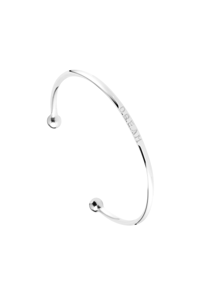 Discover our 3 mm round wire sterling silver Baby Open Bangle, hand-stamped with pleasant words such as "More", "Sun", "Dream", "Love"... You can personalise the bangle with a first name or a symbolic word of up to 6 characters. Want this bangle without engraving? That's also possible!