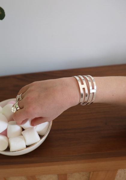 Our Baby Bamboo Bracelet consists of two parallel silver ribbons. Its pure and refined design captivates with its discreet shine and timeless appeal.