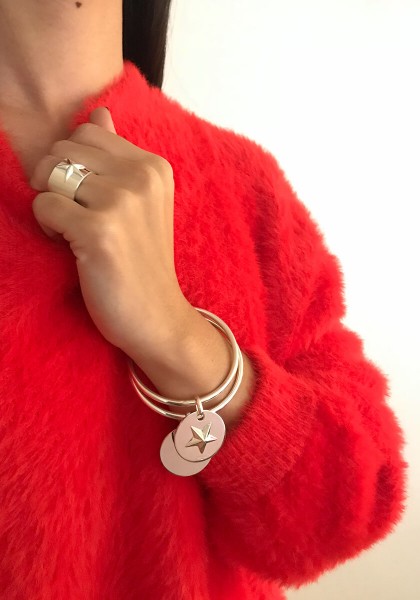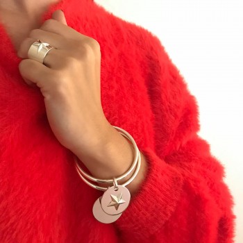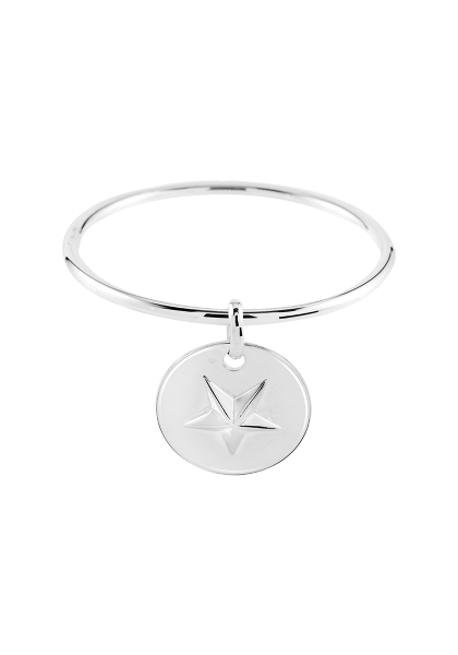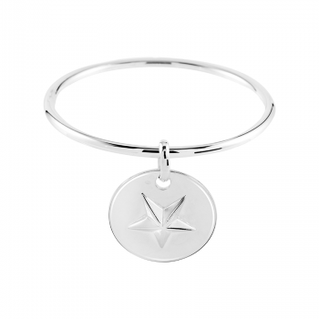 Our Star Medal Bangle Bracelet is a variation on one of the iconic pieces from the Medal Collection. It is designed with a smooth round wire and a round medal adorned with a subtly embossed five-pointed star, delicately attached to a bail, adding a sophisticated and refined touch to its design.
