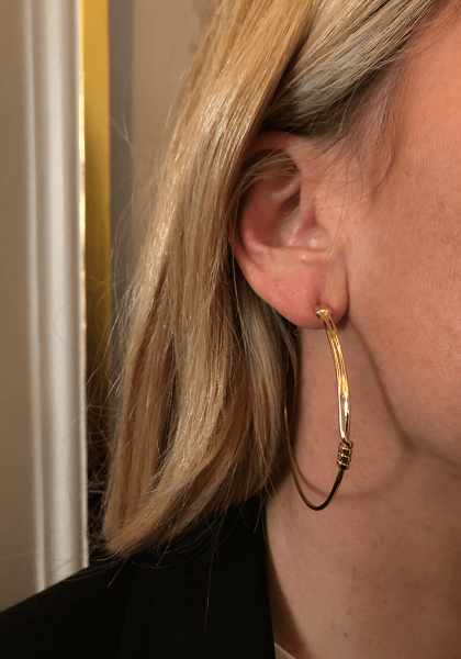 Our Yellow Gold Large Roma Earrings are large hoop earrings with a delicate, timeless design. Made of a fine, round, intertwined wire, they combine elegance and lightness to sublimate the face in a natural way.