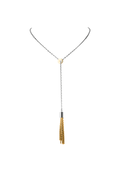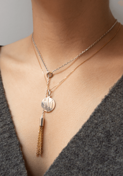 Our Yellow Gold and Silver Pompon Necklace is adorned with a delicate 18-carat yellow gold pompon at one end, while a clasp at the other end allows you to fasten it by sliding the pompon through, creating a closure that is as practical as it is elegant.