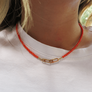 Fine and delicate, the coral beads underline the refined side of this piece. They add a touch of summer to your outfit. Each bead is unique and has a light orange hue.