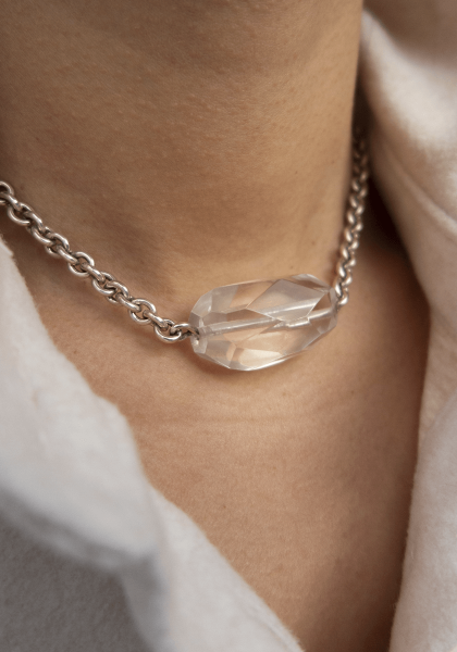 Our Ice Cube Choker Necklace rests delicately in the hollow of the neck, like a sparkle of purity. The crystal rock stone, with its luminous and transparent facets, naturally captures the light and attracts all eyes with its subtle and refined sparkle.