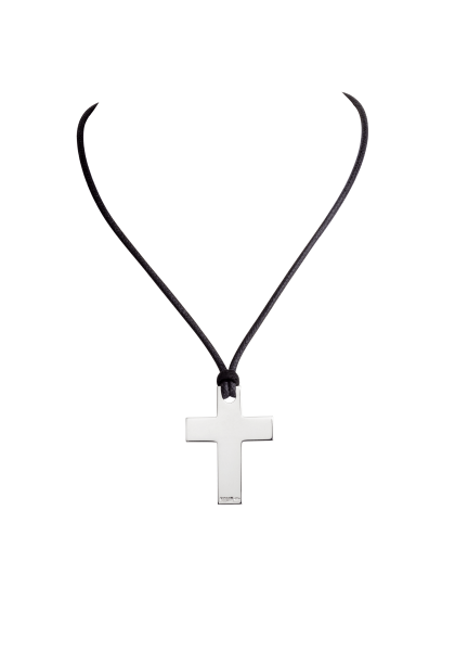 Our Small Cross Pendant features a flat silver cross mounted on a thick coated cotton cord in the colour of your choice.