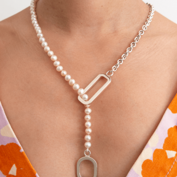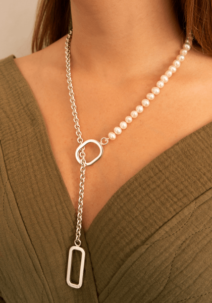 Our Lio White Pearl and Silver Necklace combines modernity and elegance thanks to its unique design that revisits the pearl necklace. Composed of a Jaseron chain and two rings with distinct shapes – oval and rectangular – as well as a ribbon of freshwater pearls, this piece plays on contrasts and geometry to offer a resolutely contemporary style.