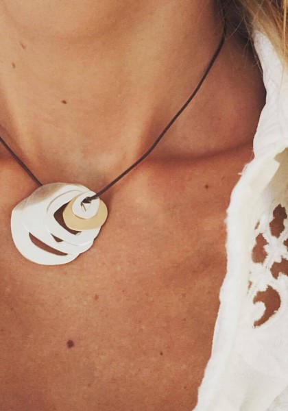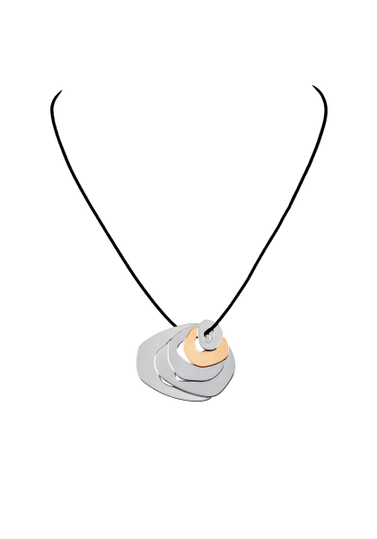 Silver and gold pendant composed of 4 silver rings and one rose gold ring, asymmetric shapes to be worn on an adjustable cotton link.