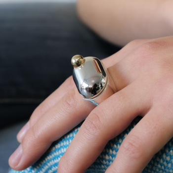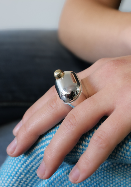 Our Yellow Gold Bead Copacabana Ring is a refined creation in which our designer plays with the curves and reflections of polished silver and yellow gold. A single 18-carat yellow gold bead is delicately inscribed on it, like a drop of light resting on the metal, creating a minimalist, modern piece of jewellery full of character.