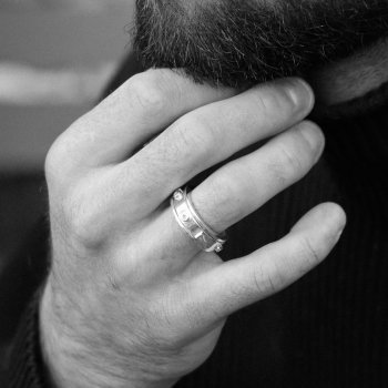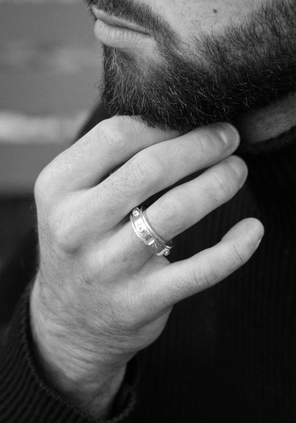 Our Small Jackpot Ring stands out with its polished silver mobile band that plays with light and movement. Punctuated with iconic graphic details, it is a sculptural and architectural piece of jewellery with a bold character. A contemporary piece, designed to be worn, to move and to catch the eye.