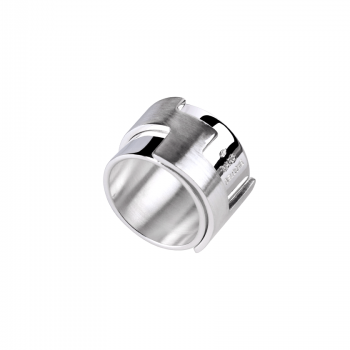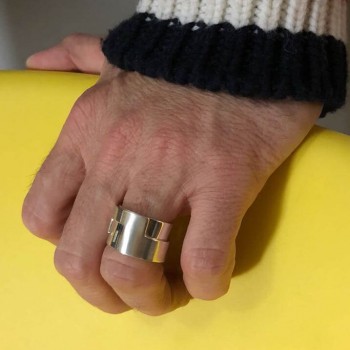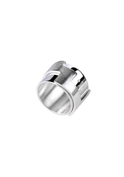 Our Double Band Ring captivates with its raw and architectural allure. Inspired by the mechanical world, it evokes precision and the strength of movement. It consists of a ring into which a second cut-out ring fits, made of brushed silver, creating a geometric pattern on the top of the ring.