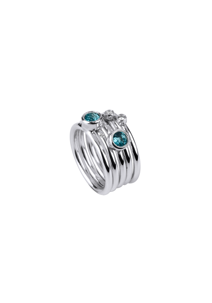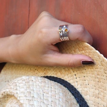 Our Seven 5-Stone Ring Set consists of five separate band-style rings. Two of them are adorned with a coloured stone of your choice, and the other three feature a diamond each.