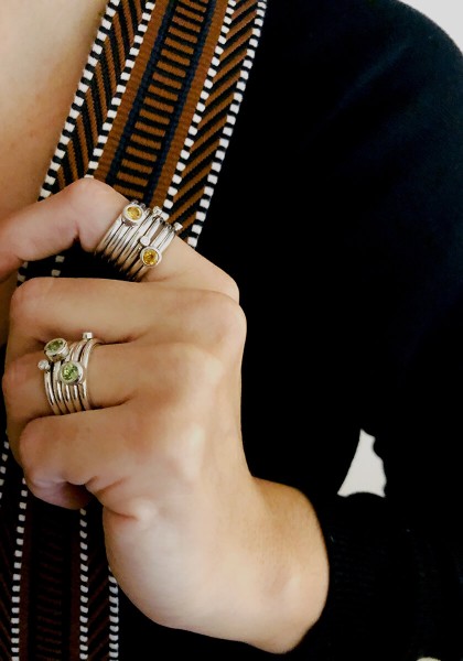 • Available stones: blue topaz (light blue), amethyst (purple), citrine (yellow-orange) and peridot (green)